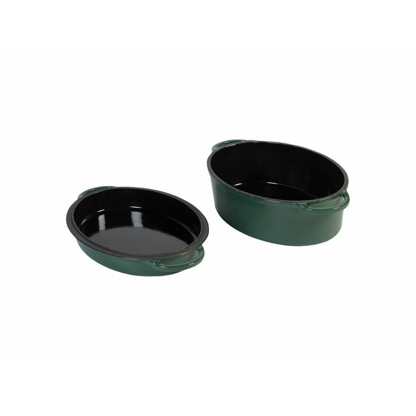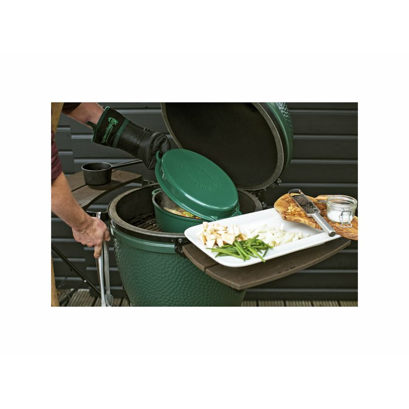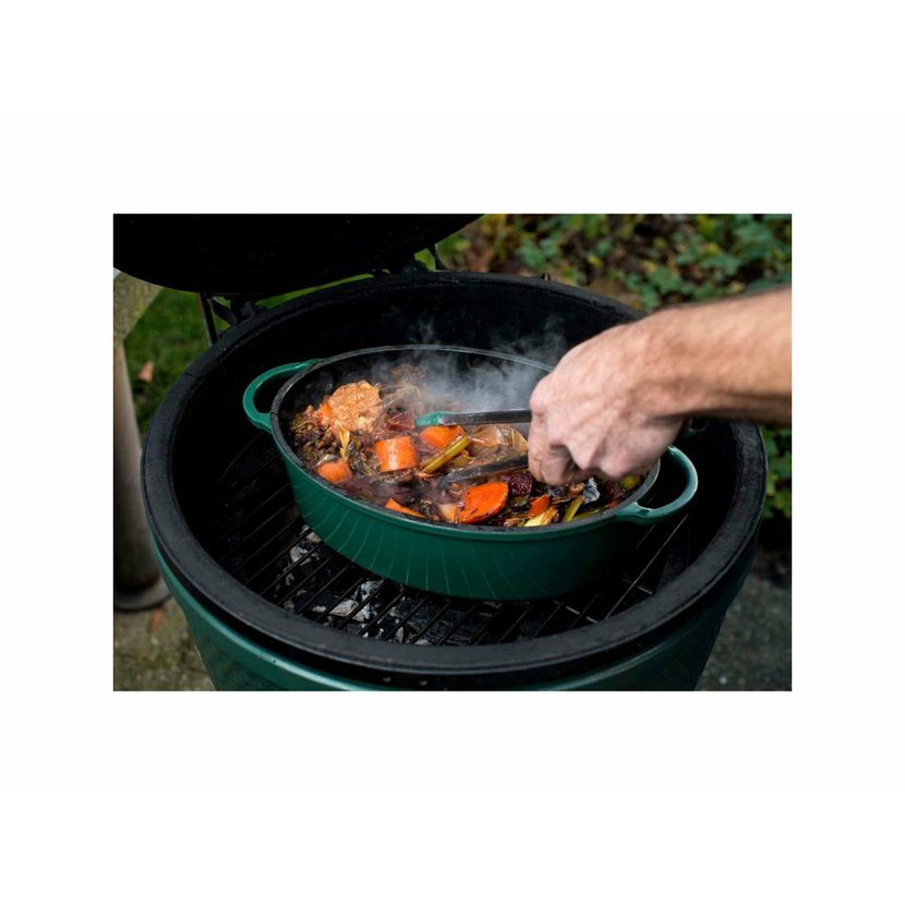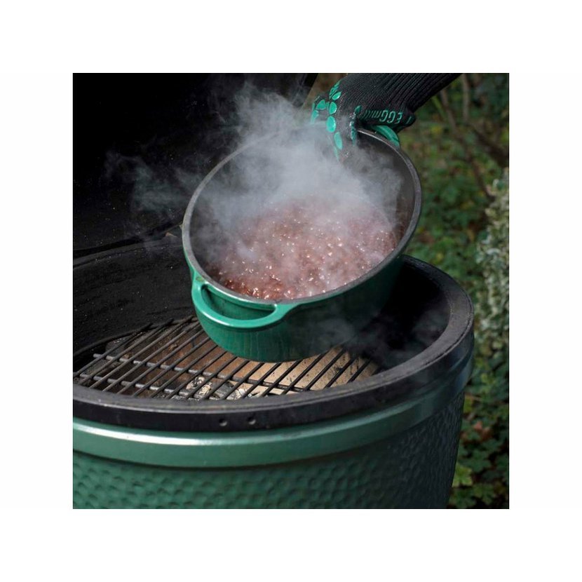 Zelené litinové kotlíky v kulatém a oválném provedení přináší další možnosti, jak využít potenciál EGGu na maximum. Jsou ideálním nádobím pro vaření polévky, dušení guláše, jídel z jednoho hrnce i pečení. Litina vyniká skvělým tepelnými vlastnostmi, ať už vaříte rychle při vysokých teplotách, nebo pozvolna na chladnoucím grilu. Kotlíky jsou doplněny o víko, které se dá použít i samostatně jako mělká pánev nebo forma na dortový korpus.
