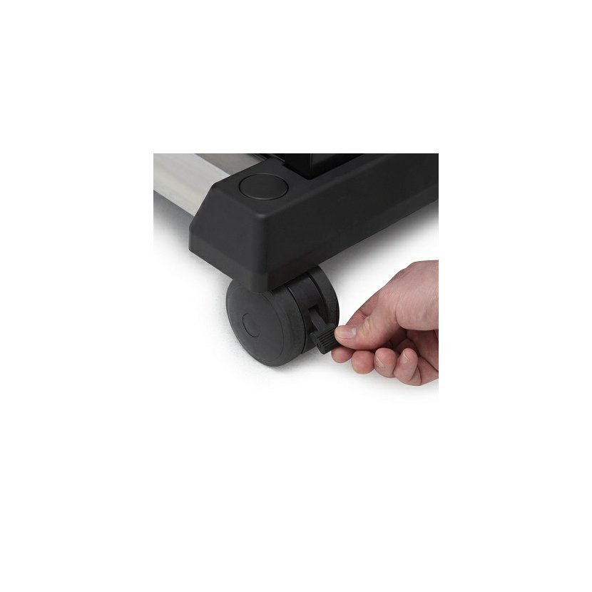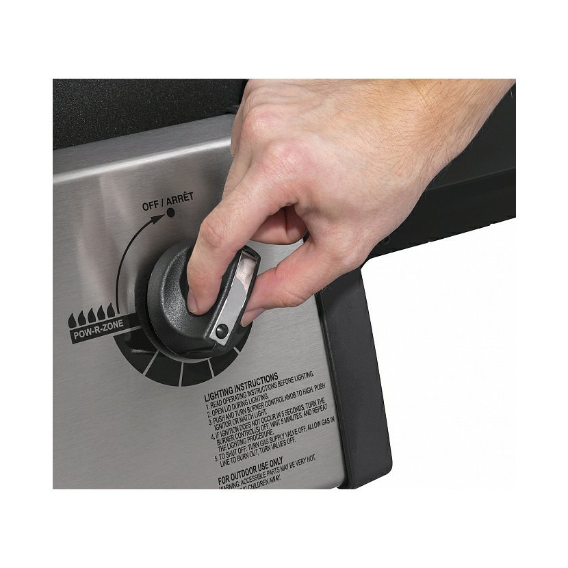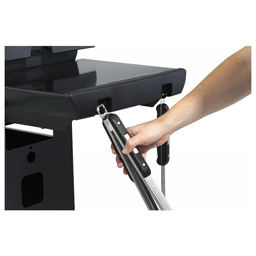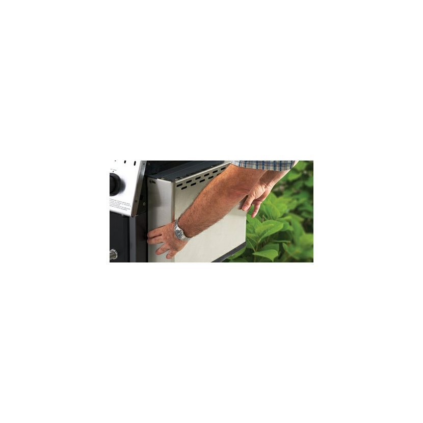 Pro kontrolu teploty slouží přehledný teploměr ve víku grilu. Elektronické zapalování Sure-Lite zapálí hořáky během vteřiny. Kola jsou opatřena zámkem-aretací tak, aby se nemohl gril posunout v nevhodný okamžik při grilování. Kromě toho nabízejí obě přední kola možnost vyrovnání grilu na nerovném terénu. 10kg plynovou lahev umístíte snadno pod gril a schováte za dvířka, takže vám nikde nebude překážet. Boční nerezové police bez vařiče lze při uskladnění grilu sklopit.