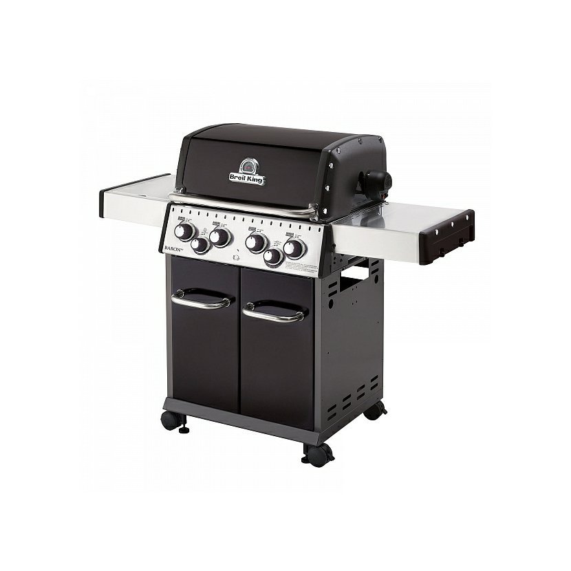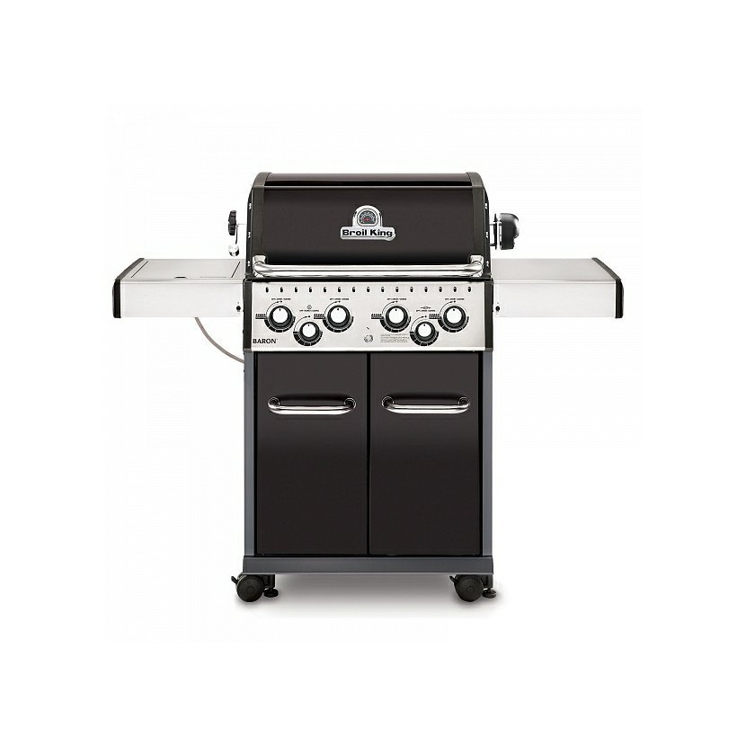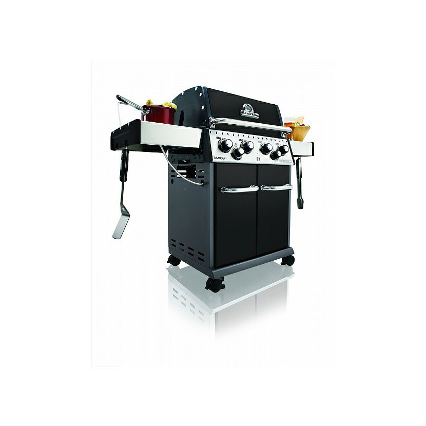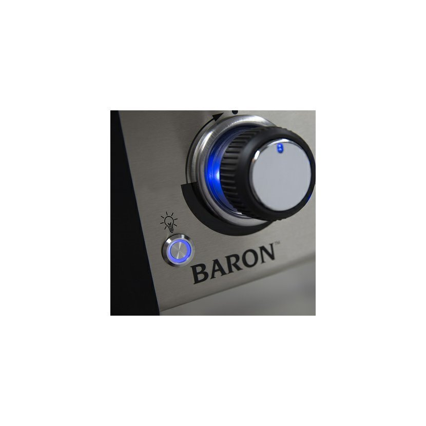 Gril Baron 490 je už v základu luxusní plynový gril se čtyřmi nerezovými hořáky, přídavným zadním hořákem pro rožnění a vařičem v postranní poličce. Grilovací rošty jsou robusní litinové a použitelné z obou stran, ostrá strana roštu je nejlepší na steaky a plochá se žlábkem na zeleninu a další drobnější potraviny.