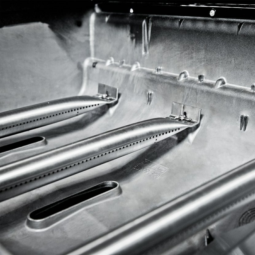 Nerezové hořáky Dual Tube zajišťují rovnoměrný plamen a výkon po celé délce hořáku a celé ploše roštu a tím je zajišťěna optimální distribuci tepla v topeništi. Více než 120 otvorů ve dvou řadách na každém hořáku poskytuje rychlé zahřátí grilu, a to i v zimním období. Hořáky jsou kryty nerezovými aromatyzery, které zachytávají odkapávající tuk a zajištují rovnoměrné rozložení tepla a odpařování vypékaných šťáv a tuků.