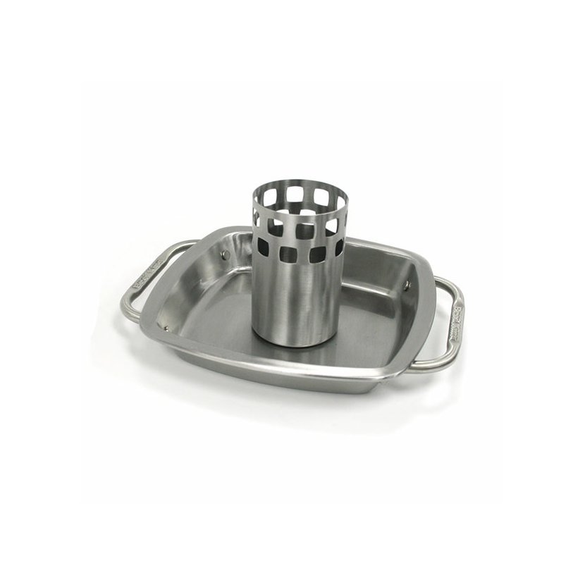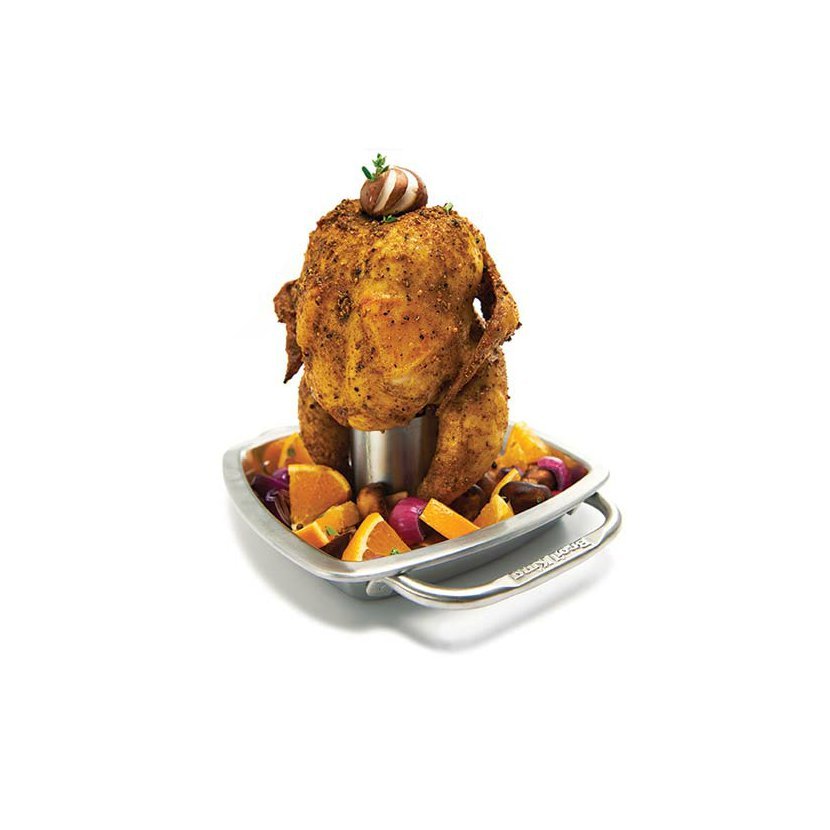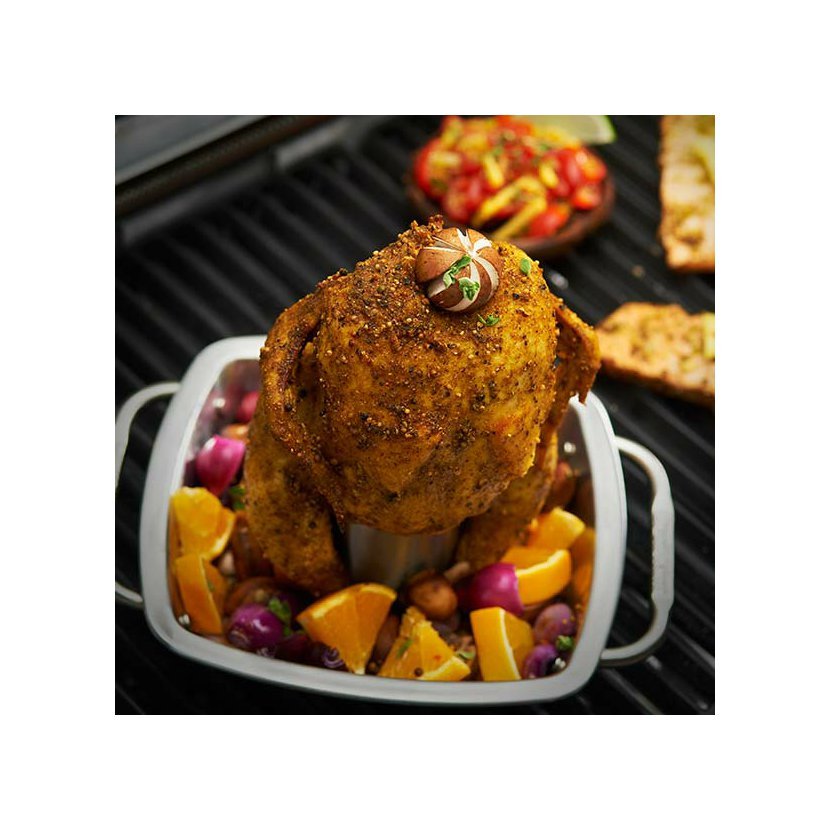 Kuře umístíte na perforovaný nástavec, do spodní části přilijete například víno, pivo, bylinou směs či vodu a vložíte vše do grilu. Robustní pekáč můžete použít, po vyjmutí středového nástavce, jako klasický čtverhranný pekáček.