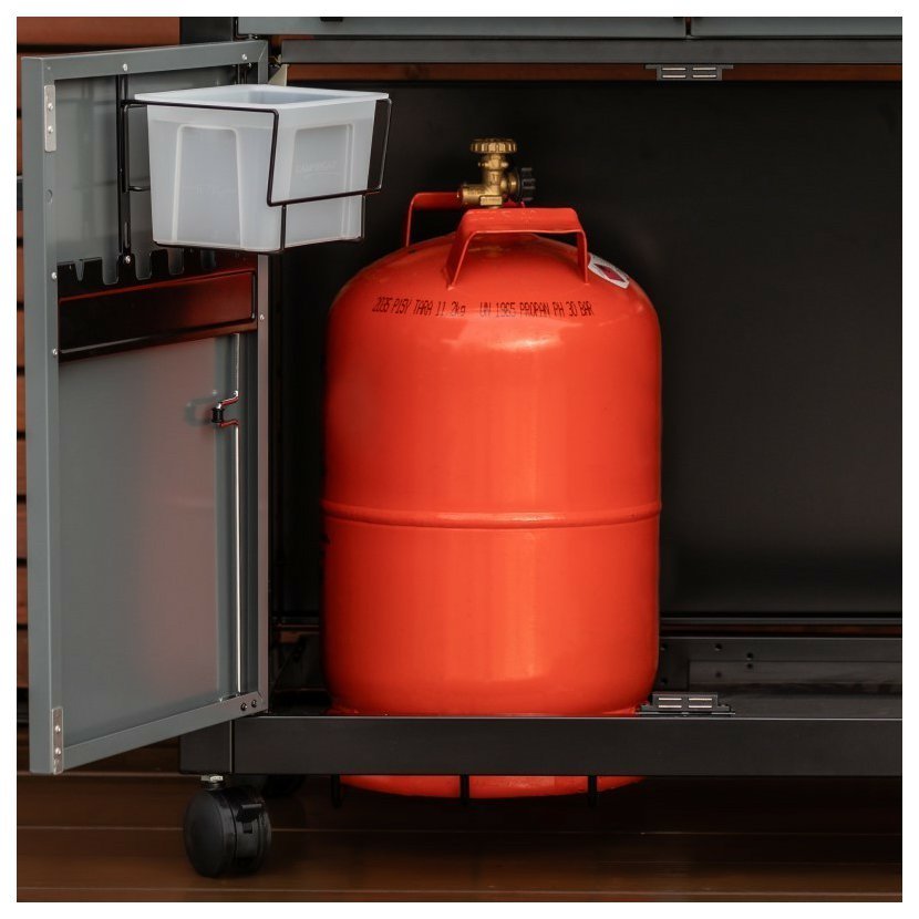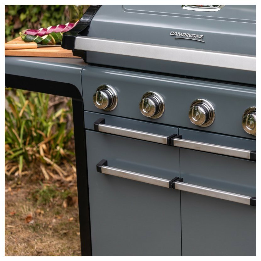 Součástí jsou i dva ohřívací rošty pro nepřímé grilování nebo udržení pokrmů v teple – rošty lze jednoduše vyjmout a vyčistit. Uvnitř vozíku se dvířky je místo na 10kg PB lahev. Na hořáky, litinové rošty, tály a víko grilu se vztahuje 5letá záruka. Gril funguje s 5kg nebo 10kg PB lahvemi a doporučujeme používat originální připojovací sadu Campingaz®.