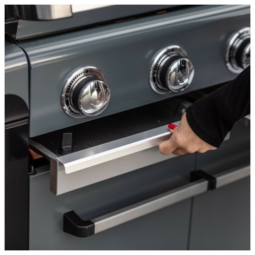 Velká varná plocha z litinového smaltovaného materiálu poskytuje dostatek prostoru pro přípravu různorodých pokrmů pod širým nebem. Nechybí ani silný postranní hořák ideální pro vaření příloh, takže můžete snadno připravit celé menu najednou.