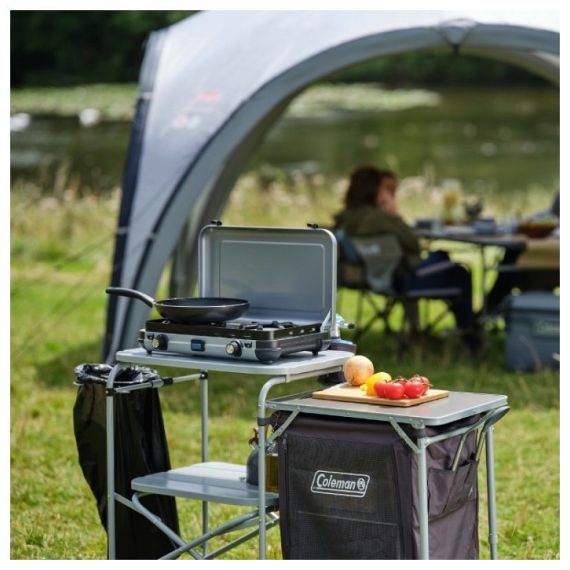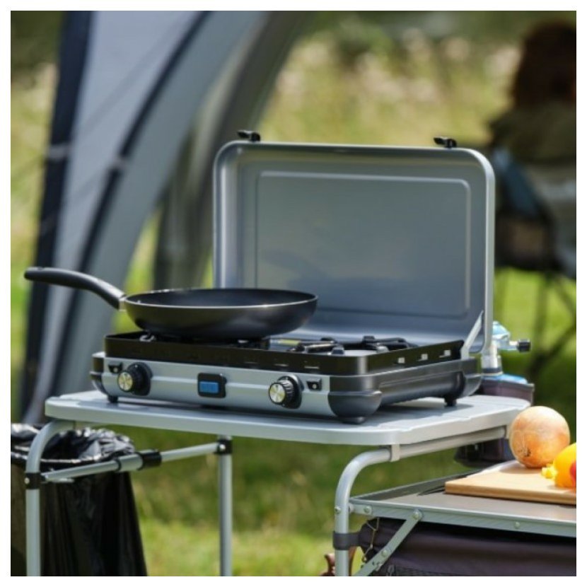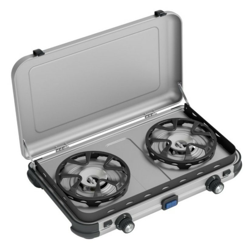 Jednoduchý vařič Campingaz Camping Kitchen 2 Maxi je ideálním společníkem pro běžné vaření v kempu, či na cestách. JE obohacen o kvalitní smaltované kryty hořáků a víko, chránící vařič proti větru, které zároveň usnadňuje přenos a uskladnění vařiče. Vařič disponuje dvěmi plochy s průměrem 28 cm a integrovanou ochranu proti větru. Tento produkt je dostupný ve dvou variantách - s připojením na běžné lahve s 50mbar regulátorem nebo na kartuše Campingaz