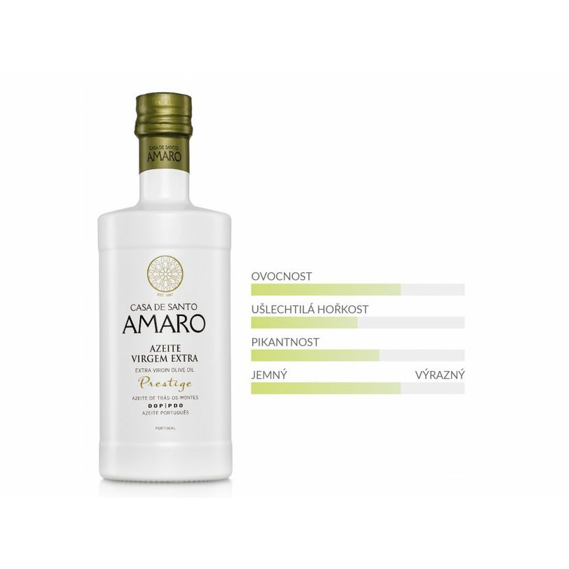 Prémiový extra panenský olivový olej Prestige Azeite patří mezi nejlepší portugalské oleje. Zaujme svěží vůní rajčat, banánu a čerstvých oliv. Díky vyvážené chuti, spojující hořkost a pikantnost, se báječně hodí k dochucení teplých i studených jídel. Tento olej má rozmanité tóny chutí a s každým jídlem působí trochu jinak. Sametově bílá láhev bude ozdobou každého stolu. Olej pocházejí z rodinné farmy Casa de Santo Amaro v regionu Trás-os-Montes, známého svými oleji světové kvality. Suché klima umožňuje pěstování oliv dle zásad šetrného hospodářství.