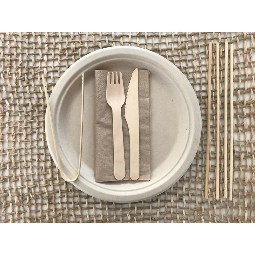 Piknikový set pro 4 osoby obsahuje čtyřikrát talíř, vidličku, nůž, ubrousek a grilovací jehlu, a k tomu jedny kleště na servírování. Vše je vyrobeno ze zcela přírodních materiálů, neobsahuje plasty, železo ani hliník.