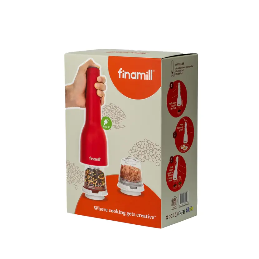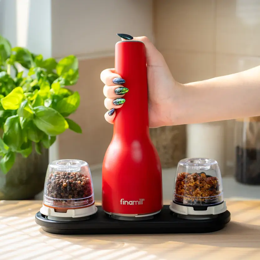 Bez námahy namele nejen všechny naše pepře, ale také sušené bylinky, oříšky či chilli papričky. Jednoduše vyměníte FinaPod a můžete okamžitě přepínat mezi různými druhy Kampotského pepře. Zvládne i tvrdší suroviny, jako jsou muškátový oříšek, skořice nebo kardamom. Stačí jediné stisknutí – a ve vaší kuchyni se otevírá nová chuťová kapitola. Nejlépe se uplatní přímo na kuchyňské lince, kde během vaření oceníte možnost mít vše čerstvě namleté, pohodlně, jednou rukou a s veškerým kořením pěkně na dosah.