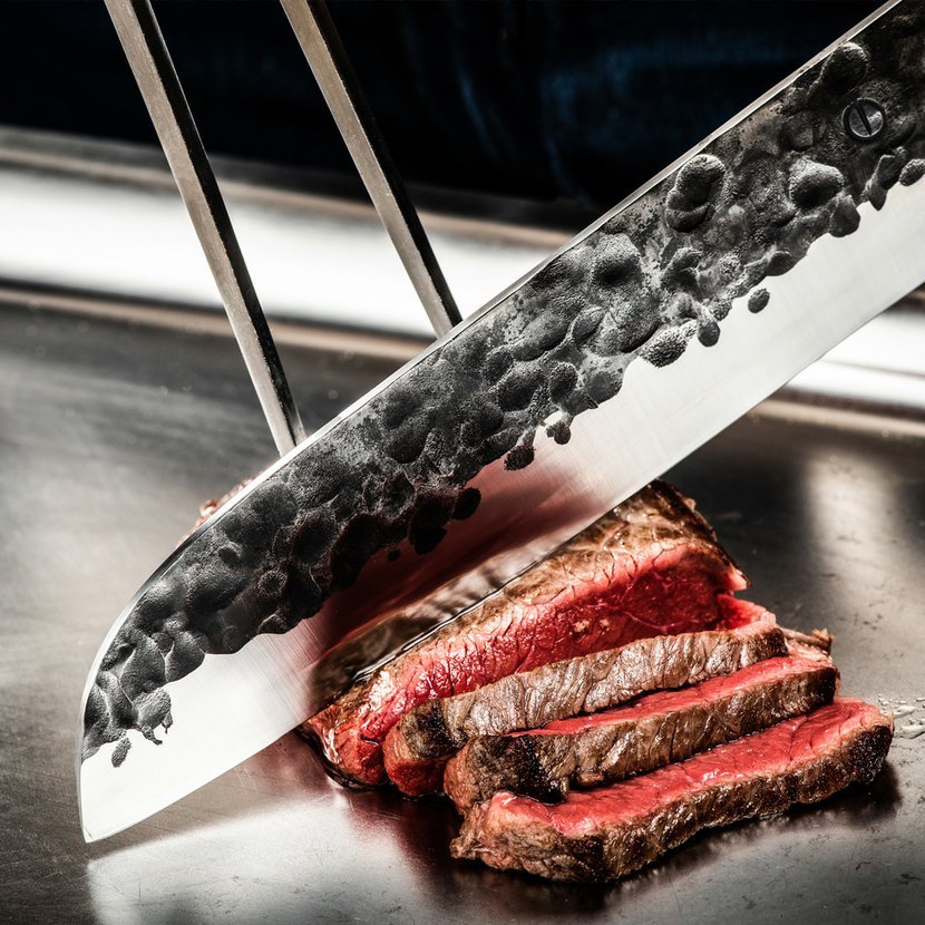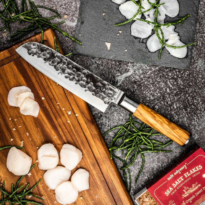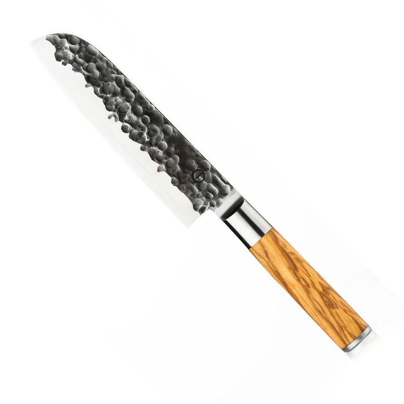 Ručně kovaný nůž Santoku s ostřím z japonské oceli a rukojetí z olivového dřeva. Univerzální nůž japonského stylu na krájení a sekání masa, ryb, zeleniny, ovoce či bylinek.