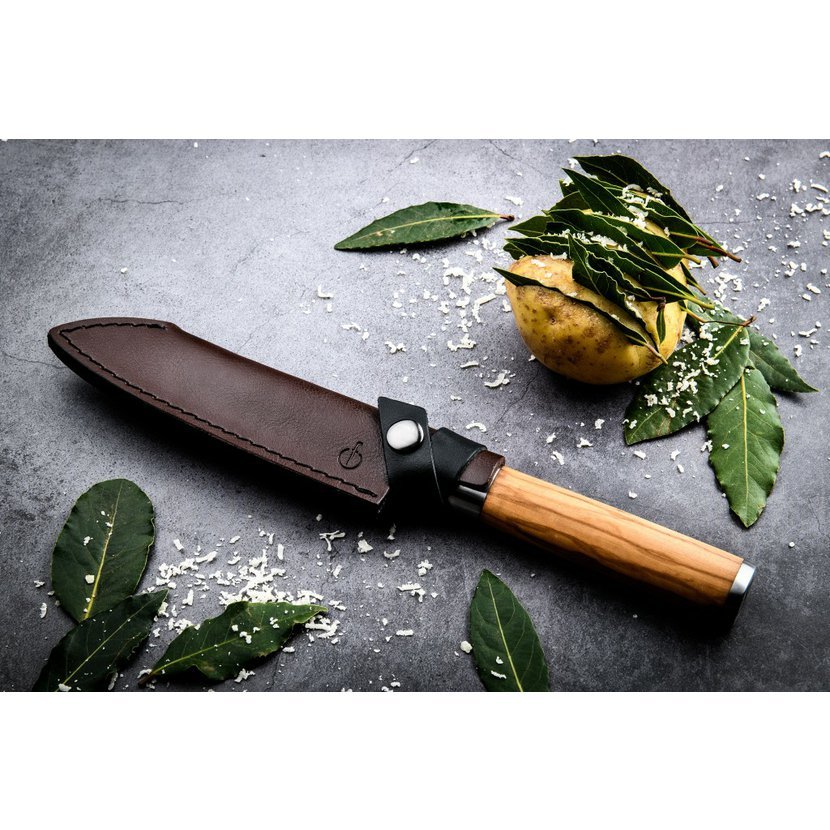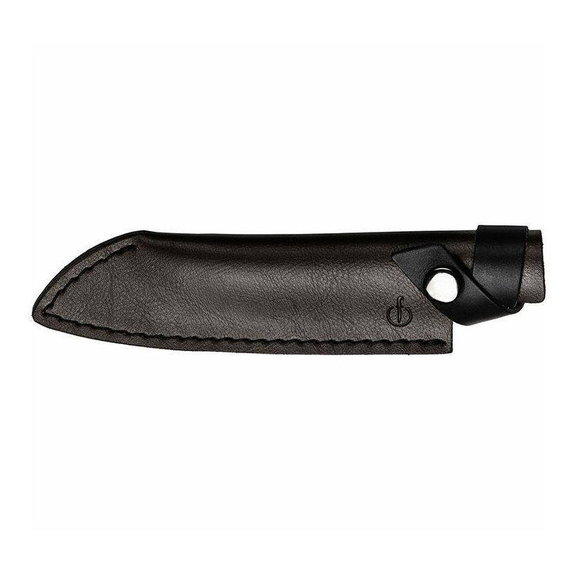 Kožené pouzdro na Santoku nůž holandské značky Forged. Pouzdro je vyrobeno z hnědé kůže surového vzhledu s černými akcenty, a perfektně se hodí k designu a provedení nože. Tento stylový doplněk zajistí, že bude váš nůž bezpečně uložen a jeho čepel bude maximálně chráněna.