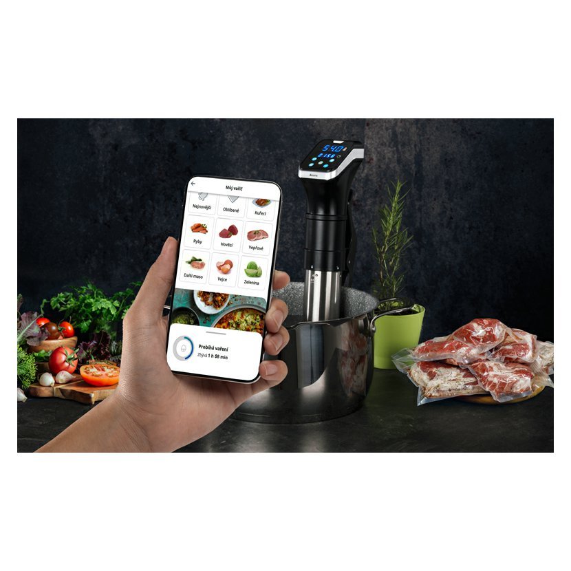 Příklad: Vložíte do hrnce s vodou zavakuované suroviny a odejdete do práce nebo na výlet. Cestou si na mobilu zvolíte recept a pošlete přes apku pokyn do sous-vide G21 Akura. Po návratu můžete prostírat.