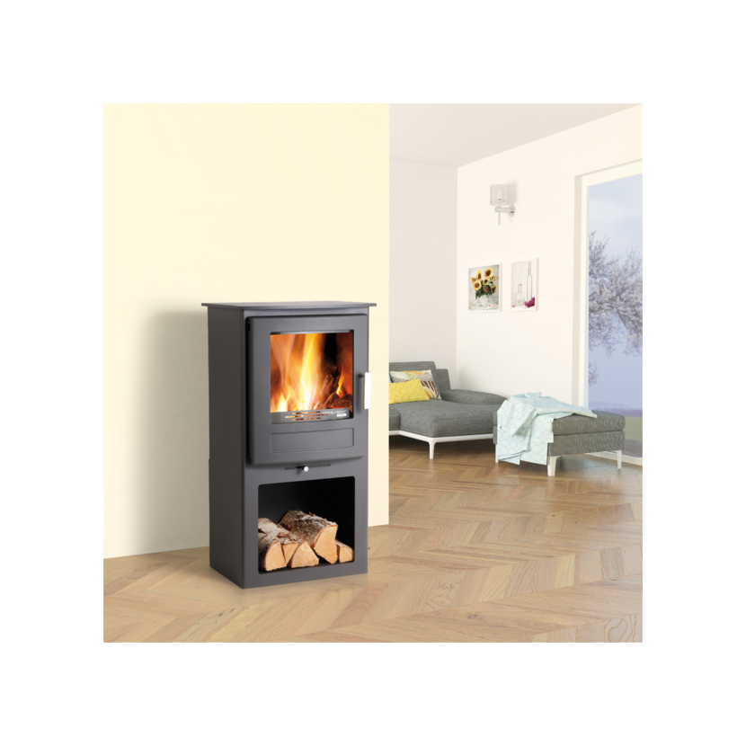 Kvalitní litinová dvířka dávají tušit, že tahle kamna budou sloužit dlouhé roky. Pod nimi najdete prostorný, téměř půl metru vysoký, box na uložení dřeva.
