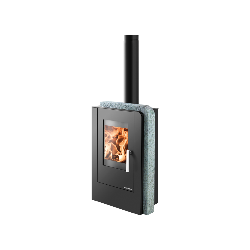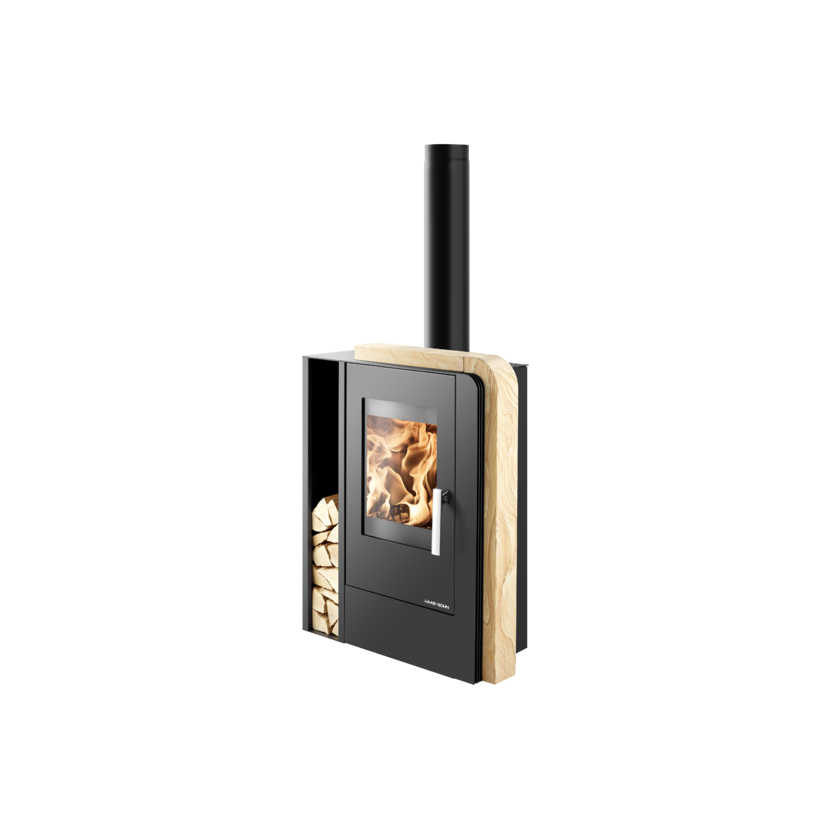 Krbová kamna Nordby zdobí elegantní půlměsíc z přírodního kamene v provedení “Woodstone Prestige” (pískovec) nebo “Speckstein Antik” (mastek).