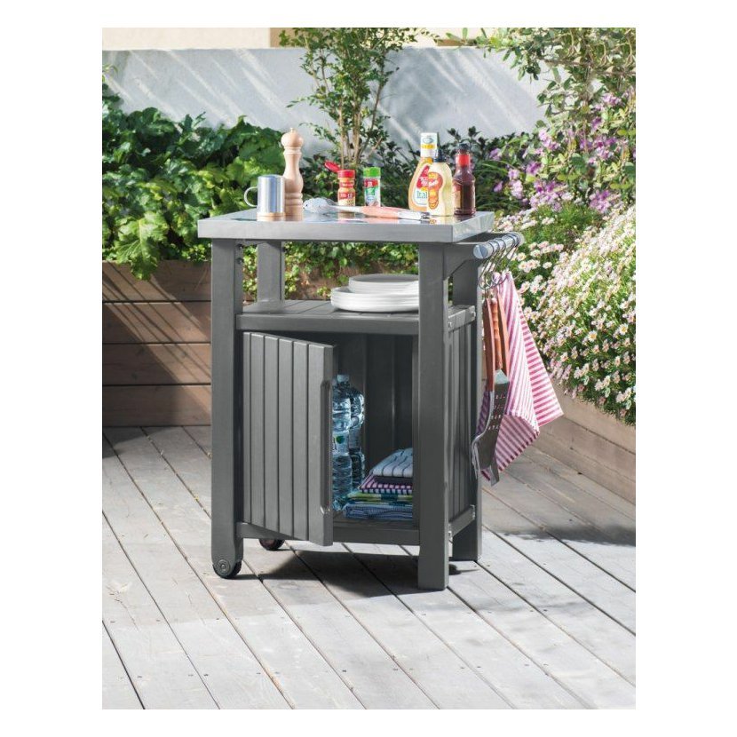 Praktický stolek pro grilování s dvěma odkládacími plochami a jedním uzavíratelným úložný prostorem.