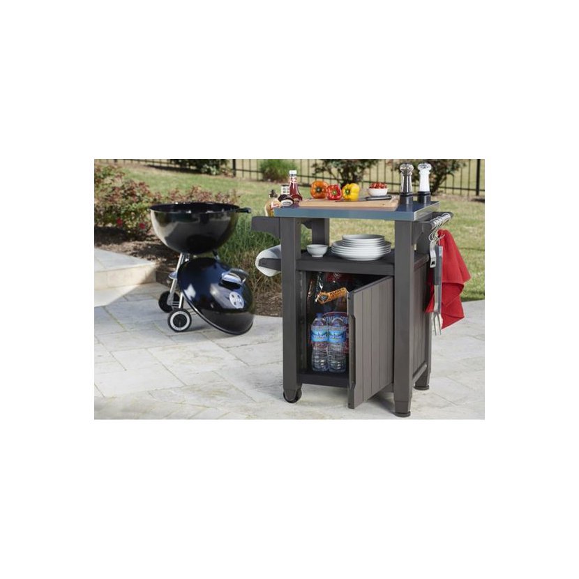 Praktický stolek pro grilování s dvěma odkládacími plochami a jedním uzavíratelným úložný prostorem.