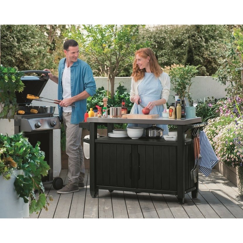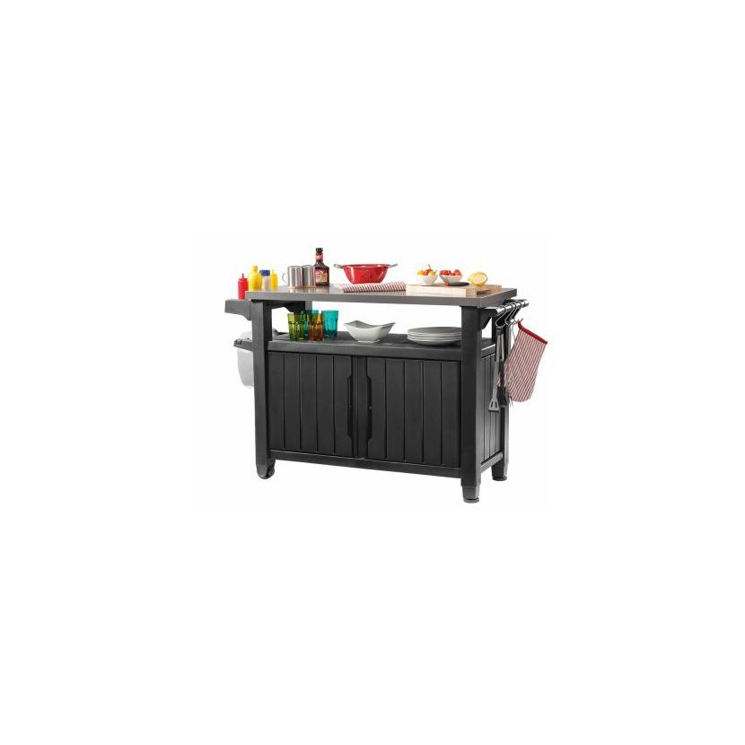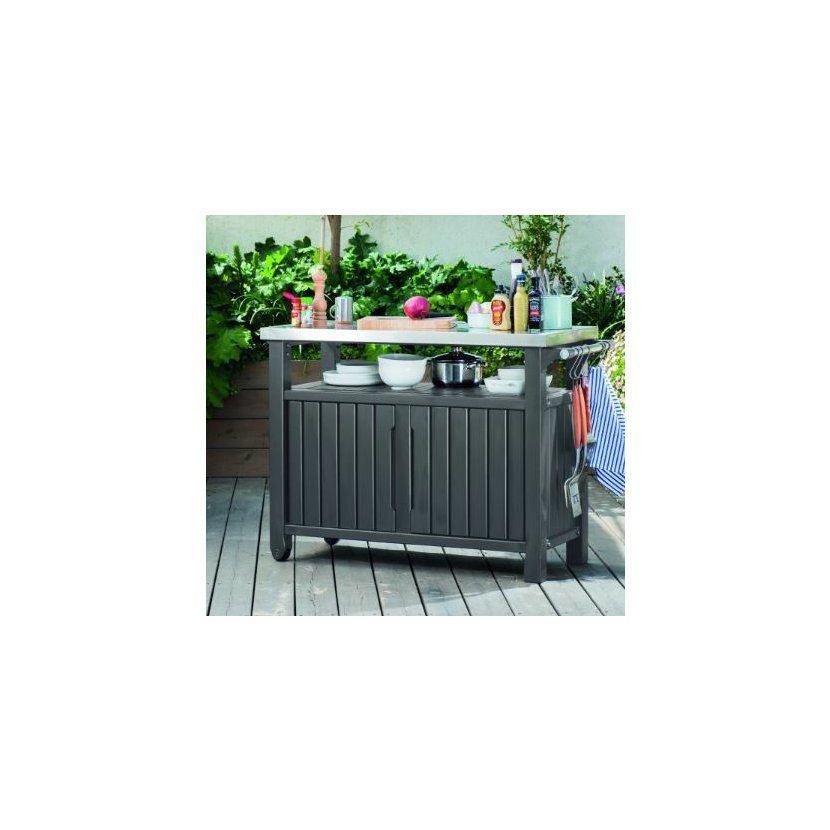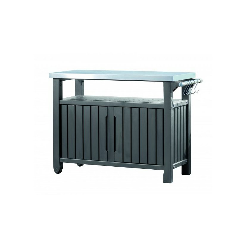 Praktický stolek pro grilování s dvěma odkládacími plochami a jedním uzavíratelným úložný prostorem.