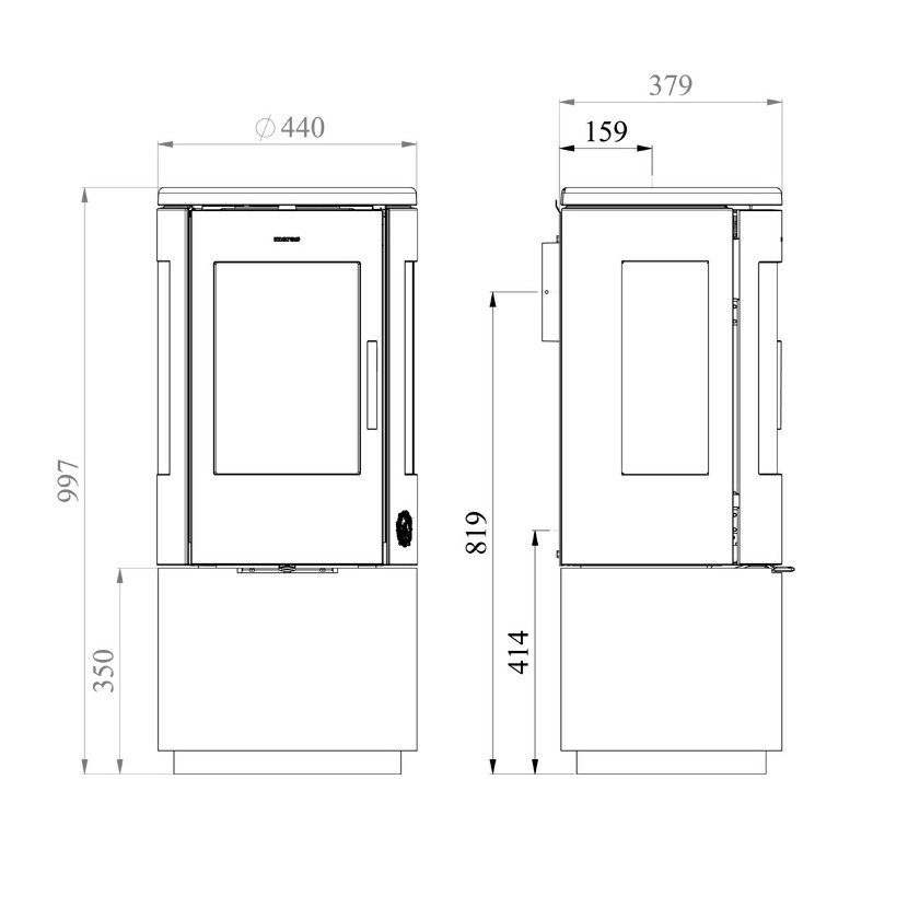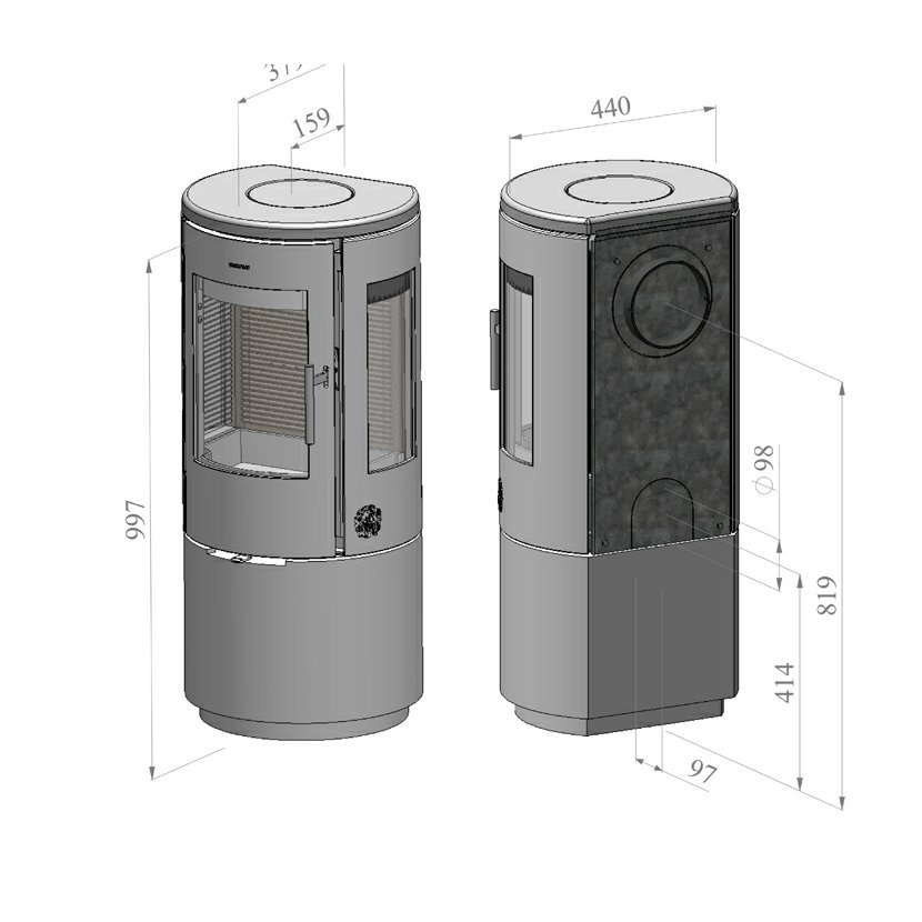 Model Morso 7443 se vyrábí ve dvou provedeních. S plným podstavcem nebo s prostorem určeným ke skladování dřeva.
