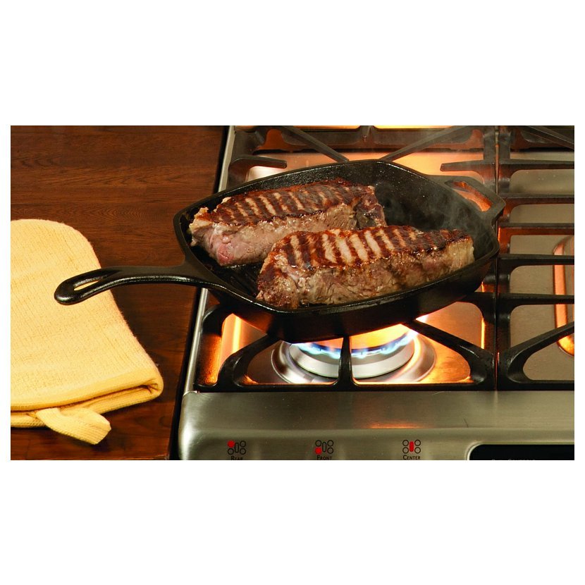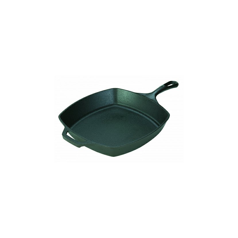Litinová čtvercová pánev Lodge 26 cm má nízké, šikmé stěny pro snadné obracení masa a vystouplou mřížku na dně, která pomůže nenasáknout tuk do potraviny. Pánev disponuje dlouhou rukojetí s otvorem pro zavěšení a pomocným držadlem, aby přenášení pánve bylo snadnější. Tato pánev má krásně provedený obrázek ryb na spodní straně dna.