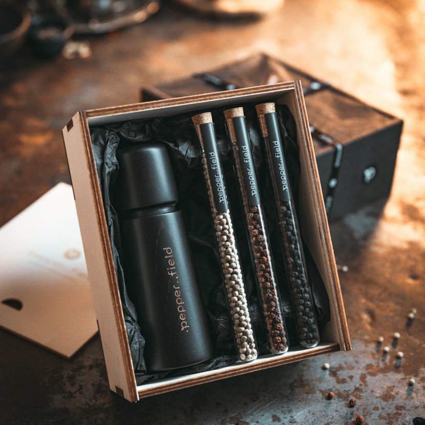 Mlýnek vám zabalíme do ručně vyrobené dřevěné krabičky – v ní najdete také luxusní sadu zkumavek se třemi druhy pepře. Zkumavky pro vás vyrobili čeští mistři skláři.