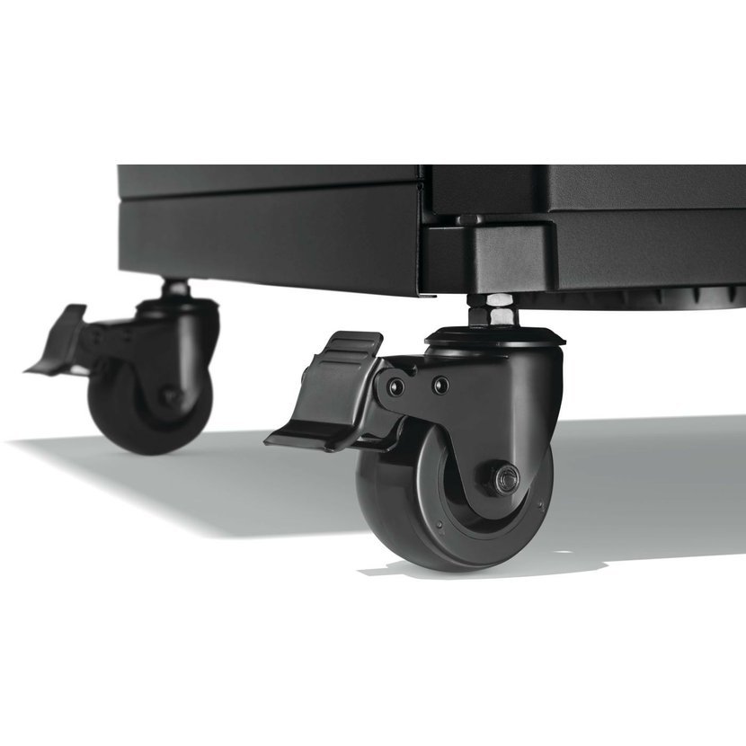 Díky výškově nastavitelným kolečkům lze gril snadno vyrovnat i na nerovném terénu. Skládací ohřevná mřížka zvětšuje pracovní plochu a nabízí možnost zavěsit např. kuřecí paličky. Uvnitř skrývá i praktické háčky na nářadí.