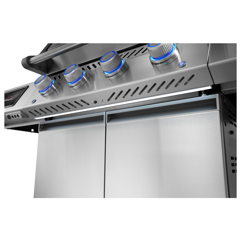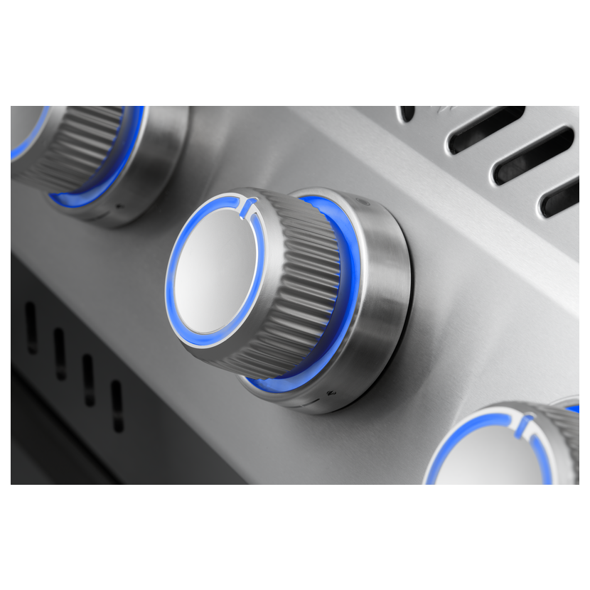 Masivní kovové knoflíky s podsvícením jsou zpracované s důrazem na každý detail. Umožňují přesné nastavení teploty i jednotlivých funkcí grilu, jsou stavěné na dlouhodobé používání a díky osvětlení je pohodlně nastavíte i za šera nebo při večerním grilování. Spojují tak komfort obsluhy, precizní kontrolu a prémiové provedení.