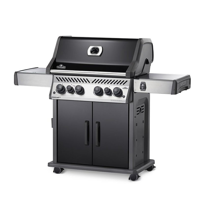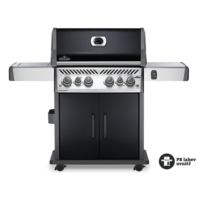 Plynový gril Napoleon Rogue 525 se čtyřmi trubkovými, nerezovými hořáky a jedním bočním hořákem umístěným v levém bočním stolečku
