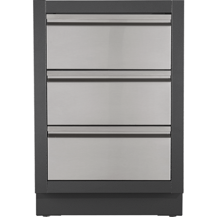 Dvě zásuvky z nerezové oceli na tichých a hladkých pojezdech nabízí praktický úložný prostor a zároveň skrytě vedou instalační otvory pro plyn a elektřinu. Díky nastavitelným nohám lze skříňku snadno vyrovnat i na nerovném povrchu.