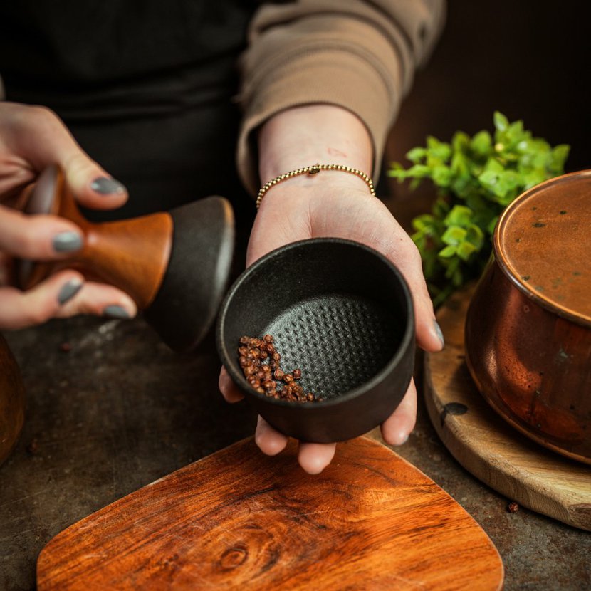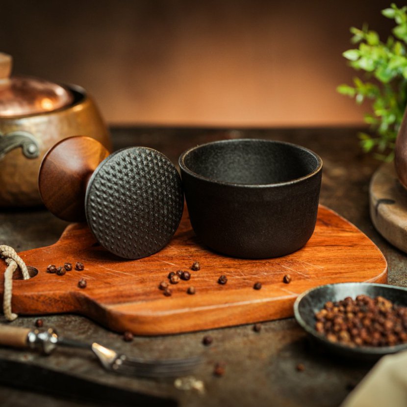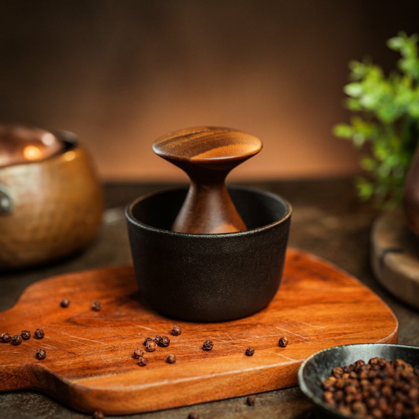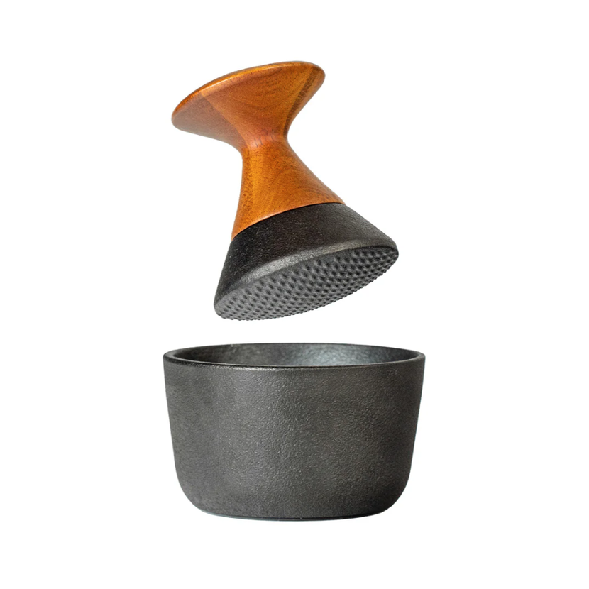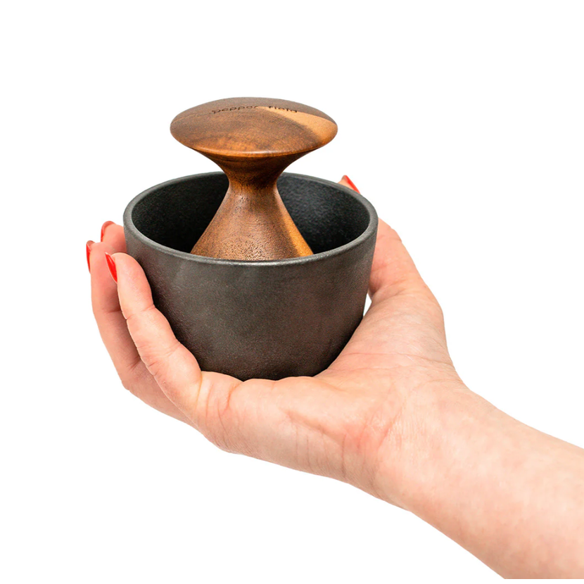 Tento inovativní hmoždíř jeprotipólem obrovských hmoždířů do kuchyně. Má pouze 10cm, vejde se přesně do dlaně a místo klasického tloučku má elegantní ergonomickou rukojeť, která zabraňuje "vyklouznutí" pepře mimo hmoždíř. Díky kvalitnímu litinovému provedení s akáciovým dřevem je však silný a těžký a zvládne i drcení na stole. Na spodní části má umístěny chytré gumové drážky, které připevní hmoždíř k jakémukoliv povrchu.