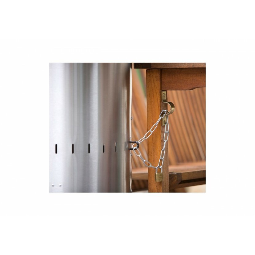 K další výbavě tohoto venkovního topidla patří kolečka pro jeho snadný transport a bezpečnostní pojistka, která zastaví přívod plynu a hořák vypne při převrhnutí topidla. Součástí balení je i hadice a regulátor pro napojení na klasické plynové láhve. Mezi další praktické vlastnosti topidla patří ještě velký odkládací stolek nad přihrádkou na láhev, bezpečnostní uzamykatelná skříňka a oko pro zajištění proti krádeži a také zasouvací hlava topidla pro jeho snadnější skladování (tyč lze zasunout, jen pokud v topidle není láhev).
