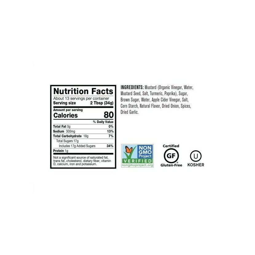 Složení: Hořčice (32%) (ocet, voda, hořčičné semínko, sůl, žlutokoren jednoduchý, paprika), cukr, přírodní třtinový cukr (cukr melasa), voda, jablečný ocet, sůl, kukuřičný škrob, přírodní aroma, sušená cibule, koření, sušený česnek.