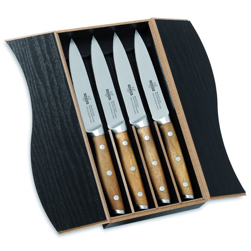 4 ks steakových nožů s délkou čepele 12 cm, celková délka nože je 24cm. Ergonomická rukojeť je vyrobena ze dřeva s dvěma kovovými nýty.