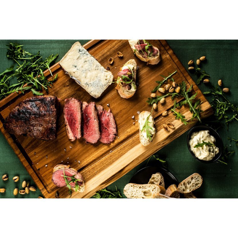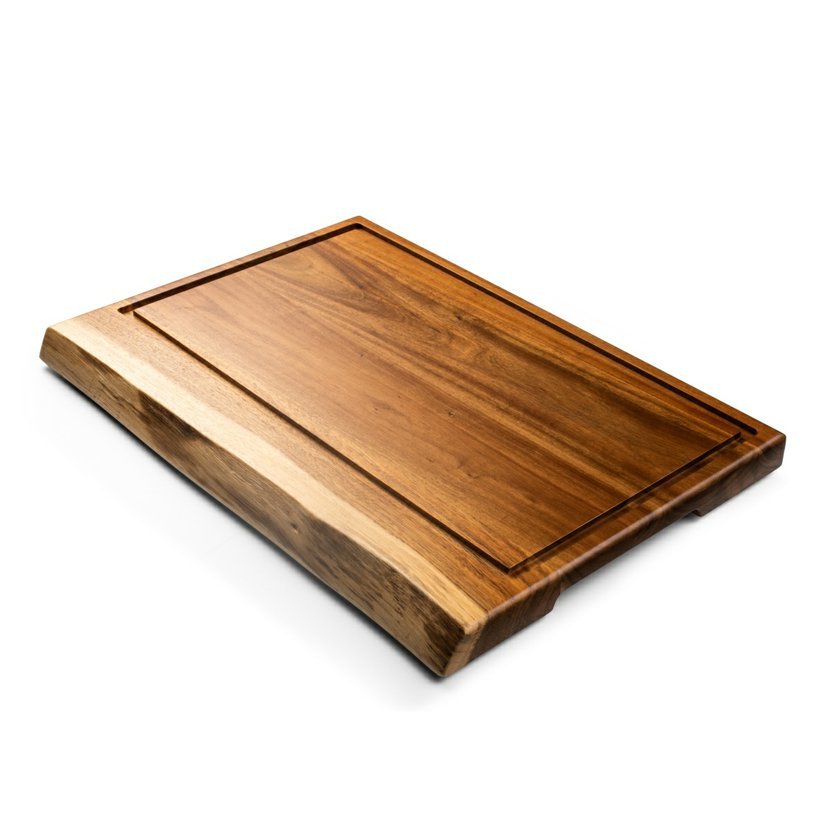 Velké krájecí prkénko je z přírodního dřeva akácie a je opatřeno čtyřmi gumovými nožičkami proti posouvání, má vyfrézovanou obvodovou drážkou pro zachycení tekutiny z potravin.