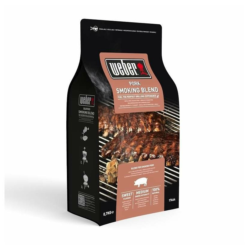 Weber ve svém sortimentu nabízí několik druhů dřeva na uzení, z nichž každý přidá svou vlastní charakteristickou vůni do grilované potraviny. Zde se jedná o udící lupínky určené především k uzení vepřového masa.