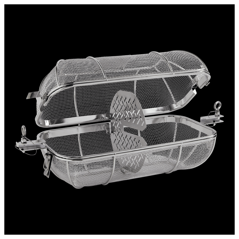 Grilovací koš na rotisserii velice jednoduše nasadíte na tyč otáčecího špízu. Snadno si tak můžete grilovat brambory, hranolky nebo zeleninu bez obav z připálení a bez starostí s otáčením.