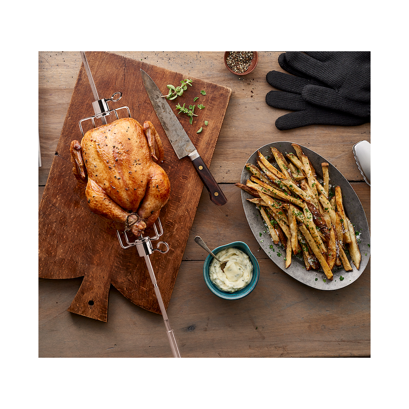 Tento elektrický rožeň 230V je navržen pro plynové grily Weber Spirit 200, 300, 400 (od roku výroby 2025) a lze jej využít také pro individuální instalace do vlastních grilů, zahradních ohnišť nebo krbů. Je ideální pro rovnoměrné a pohodlné grilování drůbeže a velkých kusů masa, jako jsou pečeně nebo celá kuřata, aby bylo maso dokonale propečené a velmi šťavnaté. Otáčejte pokrmy díky robustním vidlicím vyrobeným z ušlechtilé oceli a jistému uchycení pomocí jehle se dvěma vidlicemi. Využijte velmi výkonný elektrický motor pro optimální výsledky a bezproblémové grilování.