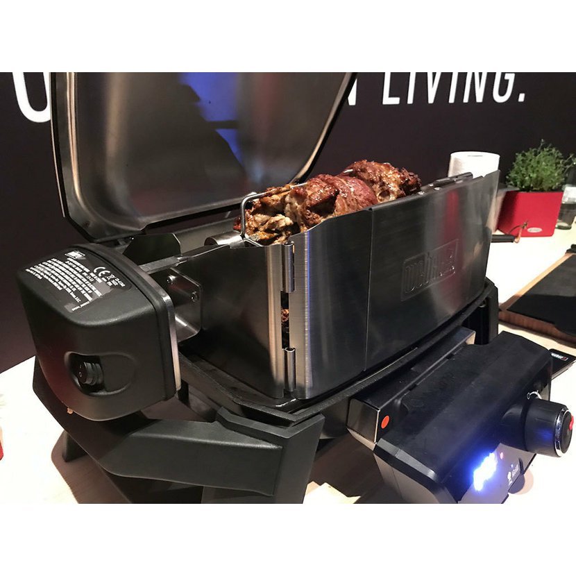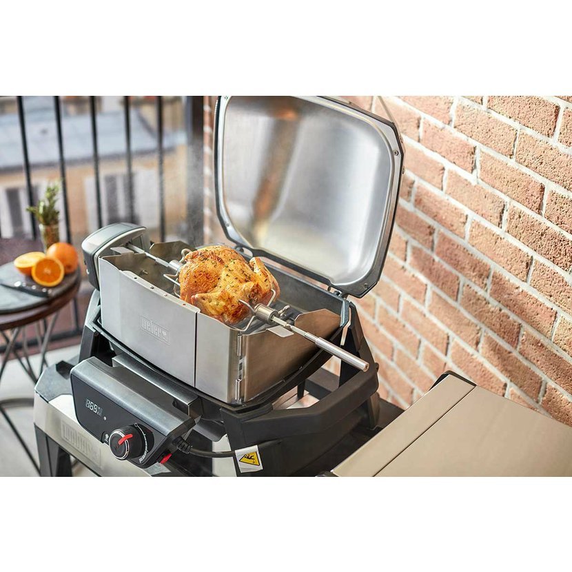 Představujeme vám otáčecí špíz pro zbrusu nové elektrické grily Weber Pulse poháněný elektrickým motorkem. Špíz je ideální pro přípravu grilovaného kuřete a dalších větších kusů masa. Je kompatibilní se všemi elektrickými grily Weber Pulse.