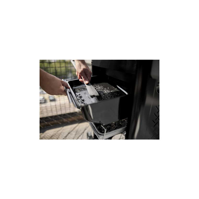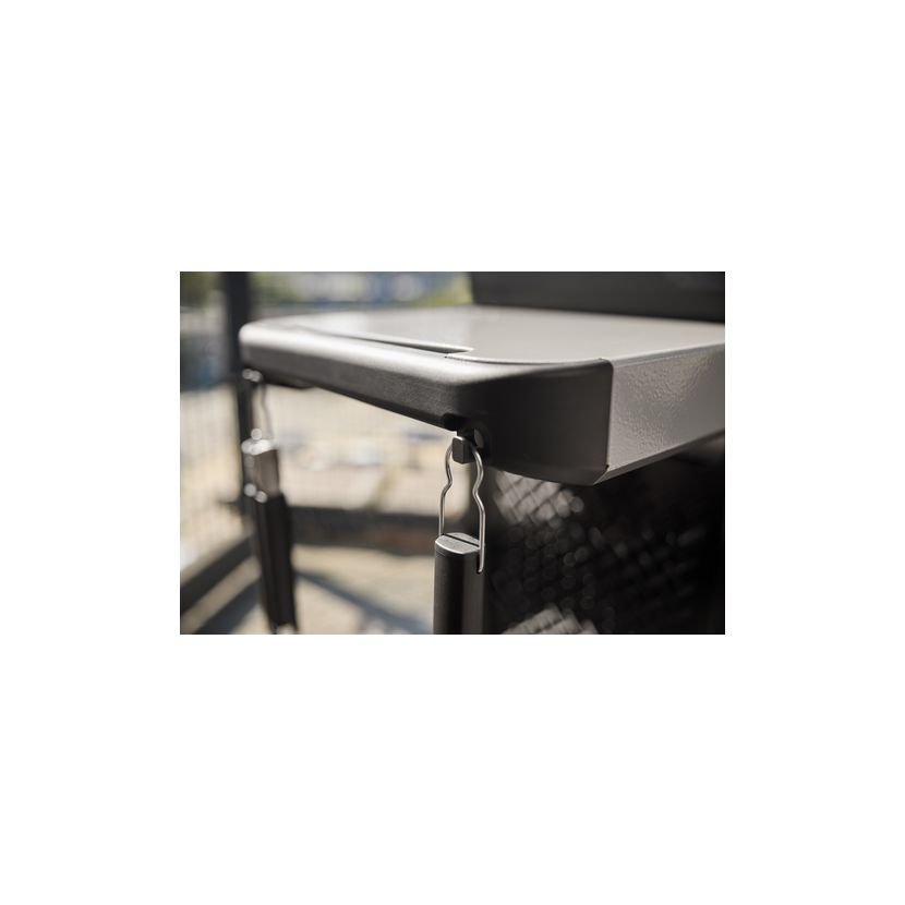 🌟 Odkládací prostor: Ocelové boční stolky s háčky na nářadí a možností připojit doplňky systému Weber Works Snap-On. Pravý stolek je navíc sklápěcí, což šetří místo.