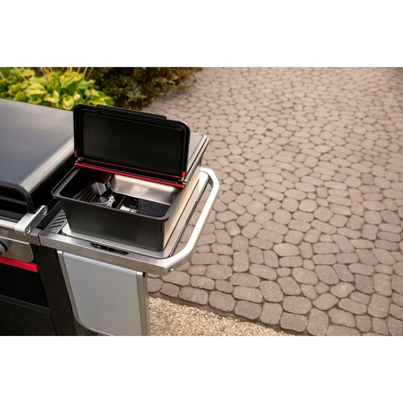 Díky systému Weber Works si můžete k postrannímu stolku připojit další praktické doplňky, jako jsou držáky na koření, ubrousky, olej nebo světlo, a vytvořit si tak dokonalou venkovní kuchyni. 🍖🔥